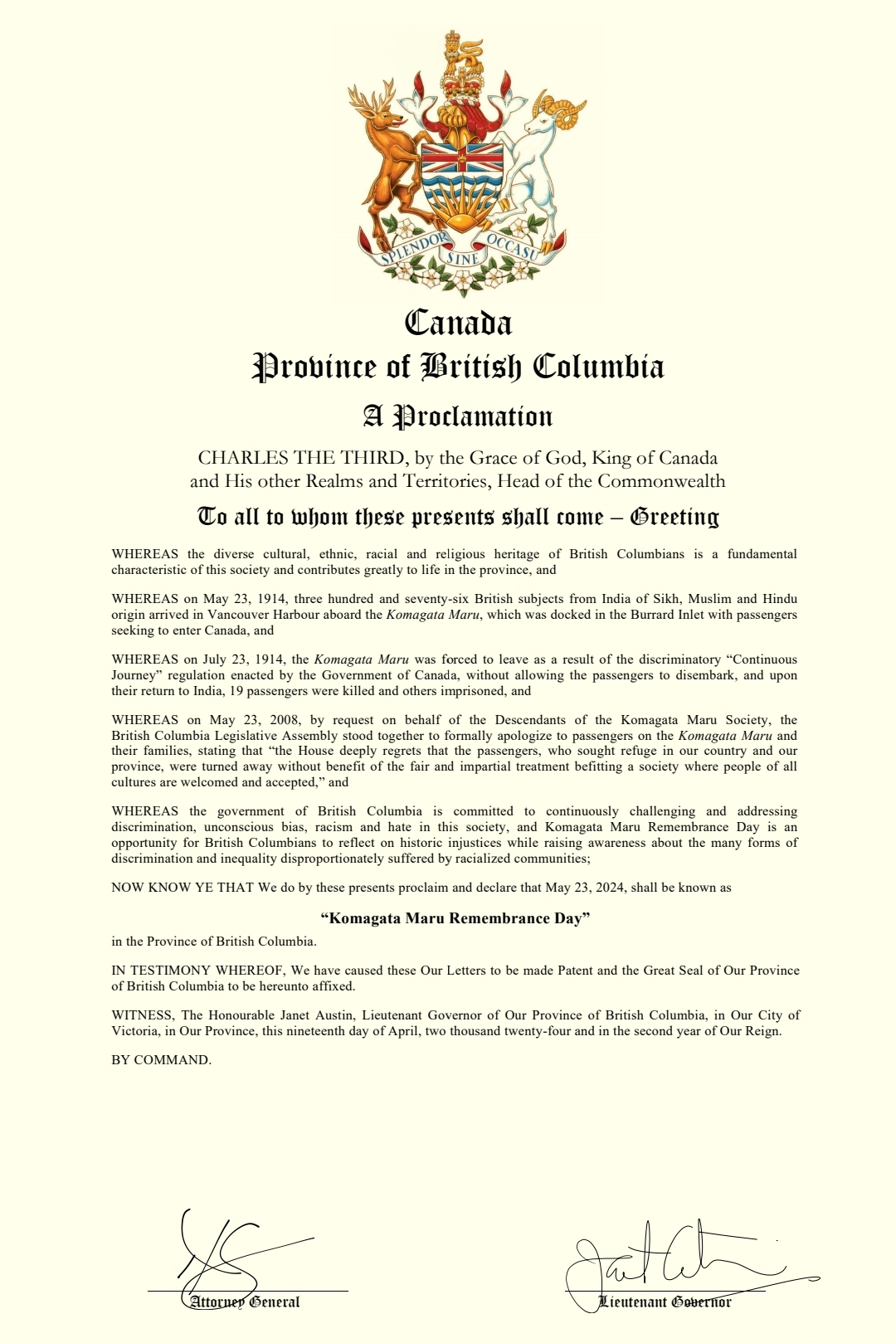 To commemorate the incident, the Indo-Canadian Workers Association were presented with a proclamation by Jinny Sims, MLA from Surrey-Panorama on the 23rd of May, 2024, known today as Komagata Maru Day. The proclamation which has been issued by the government of British Columbia, remembers and honours the 376 innocent souls, on board the Komagata Maru, who had to suffer due to the shamefully racist immigration policies prevalent in Canada back then. The proclamation was received by members of ICWA’s executive committee in a small ceremony in Surrey, BC.